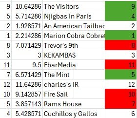 I know. You’re 5th in the standings, I don’t deny standings I just rank power. A little recap on the math (facts) that is behind the power rankings. 3 categories that we each get a score from 1-12, combine the 3 scores and whoever has the highest number has the highest rank. Your highest power category is Record with a 8-4 record, the same record (SPOILER ALERT) as the next team above you who will also complain about their rank, you tie in that category and share 16 power points, 8 each. 8 power point for The Mint for Record. The next Category is Total Points, this is where you take a big steamy Lady M dump at 1306.5, perspective, Rams House 100 points above that, Cuchillos +114, Njigbas +14.5 (that’s why you only rank 6th my boy), And your rank mate Trevor’s 9th +35. So 5 Power Points for Total Points, 13 Power Points in the first 2 categories. Last is my favorite Breakdown record, this is your overall record against the entire league if you played every team, every week, instead of the tomato cans you and Jorge get week after week. Just like Total Points, your Breakdown Record only beats the Mathematically Eliminated bracket of this power ranking at 81 wins, 5 power points (Njigbas 89, Cuchillos 90, T’s 9th 86, Rams 91). 18 total power points, Trevor’s 9th has a 5 for Record, 7 for total points, 6 for breakdown, 18 total points. A tie is a tie this means that even though you currently hold the 5 seed, the numbers say you are likely to lose it. But the numbers don’t matter this week after your big win over Cuchillos, who put up 186.5 over Fire Sail in week 11 but went minus a Gretzky against you at 87.5 in week 12. That W put you in a win and in matchup against Njigbas. Whoever wins clinches a playoff spot, a loss does not kick you out of the show quite yet either but secure it now with that W (we’ll talk about that next week👽). I’ll continue the matchup preview in his rank…